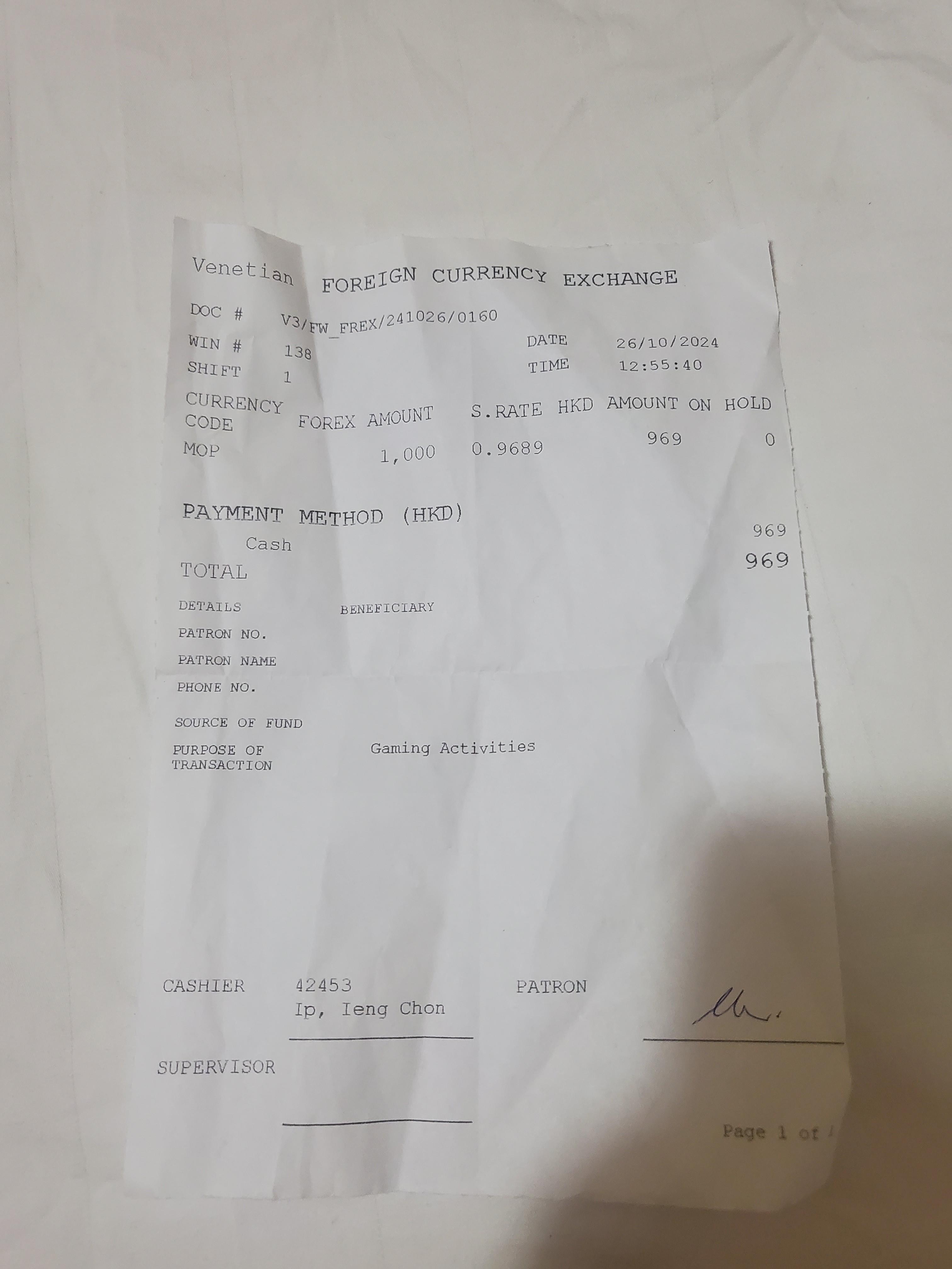 카지노에서 1,000MOP 지폐를 내고, 500MOP만 환전해 달라고 했더니 안된다고 했다